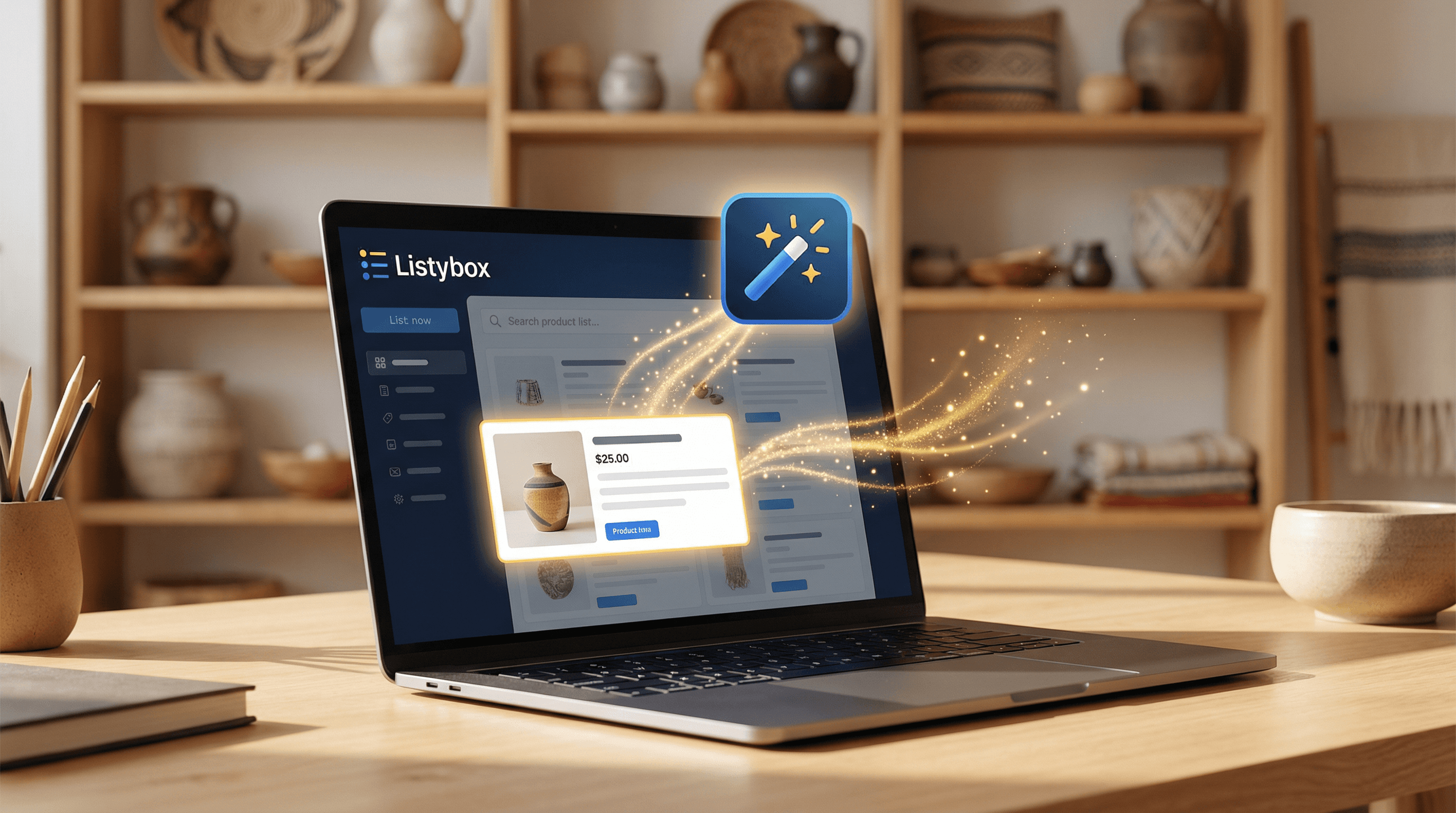 This is exactly why Listybox developed the Magic Wand feature. Instead of spending hours on keyword research, you simply click one button. The system analyzes what's actually selling in your niche, identifies the keywords competitors are using to rank, and generates a complete, optimized listing in seconds. Sarah's 750-hour nightmare? Reduced to an afternoon.