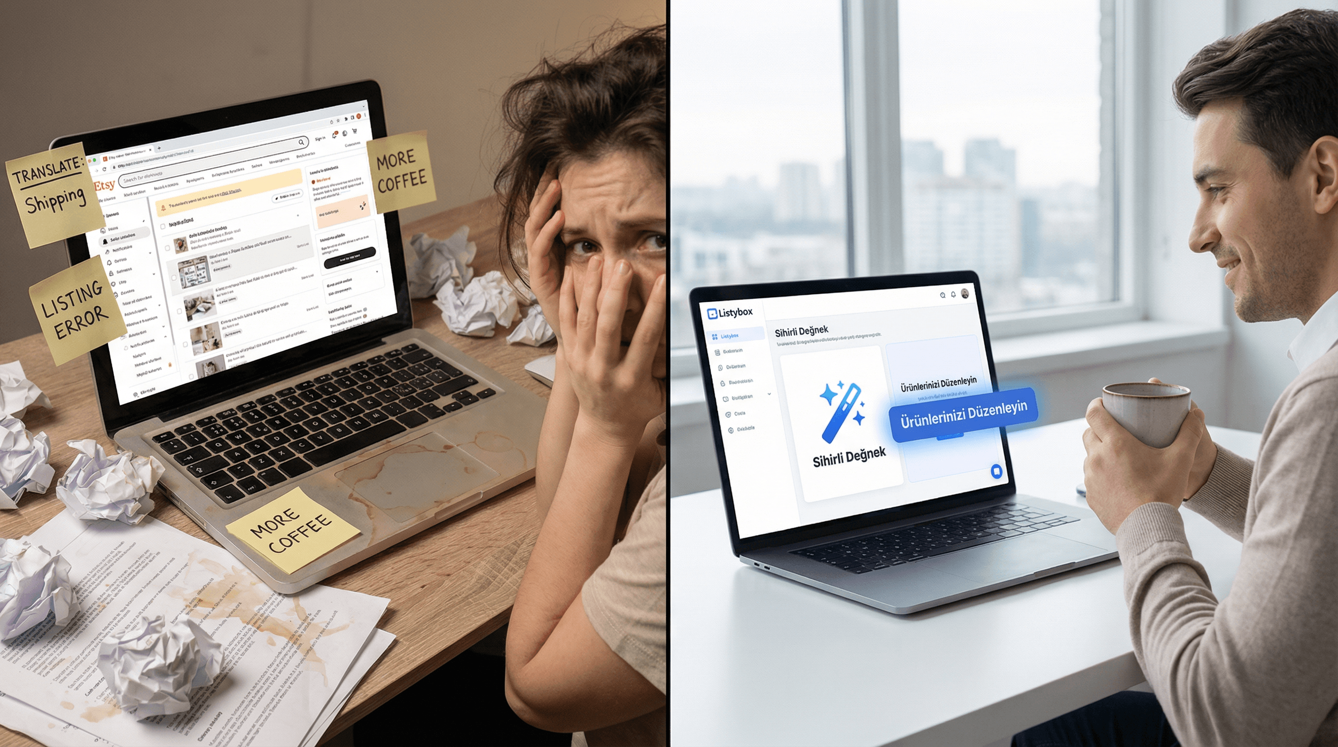 6. The Transformation: Sarah's dread turns into delight. She no longer fears the login screen. Listybox handles the boring technical parts, leaving her free to do what she loves: create art. Her shop grows to 100 listings in a week—something that would have taken months manually.