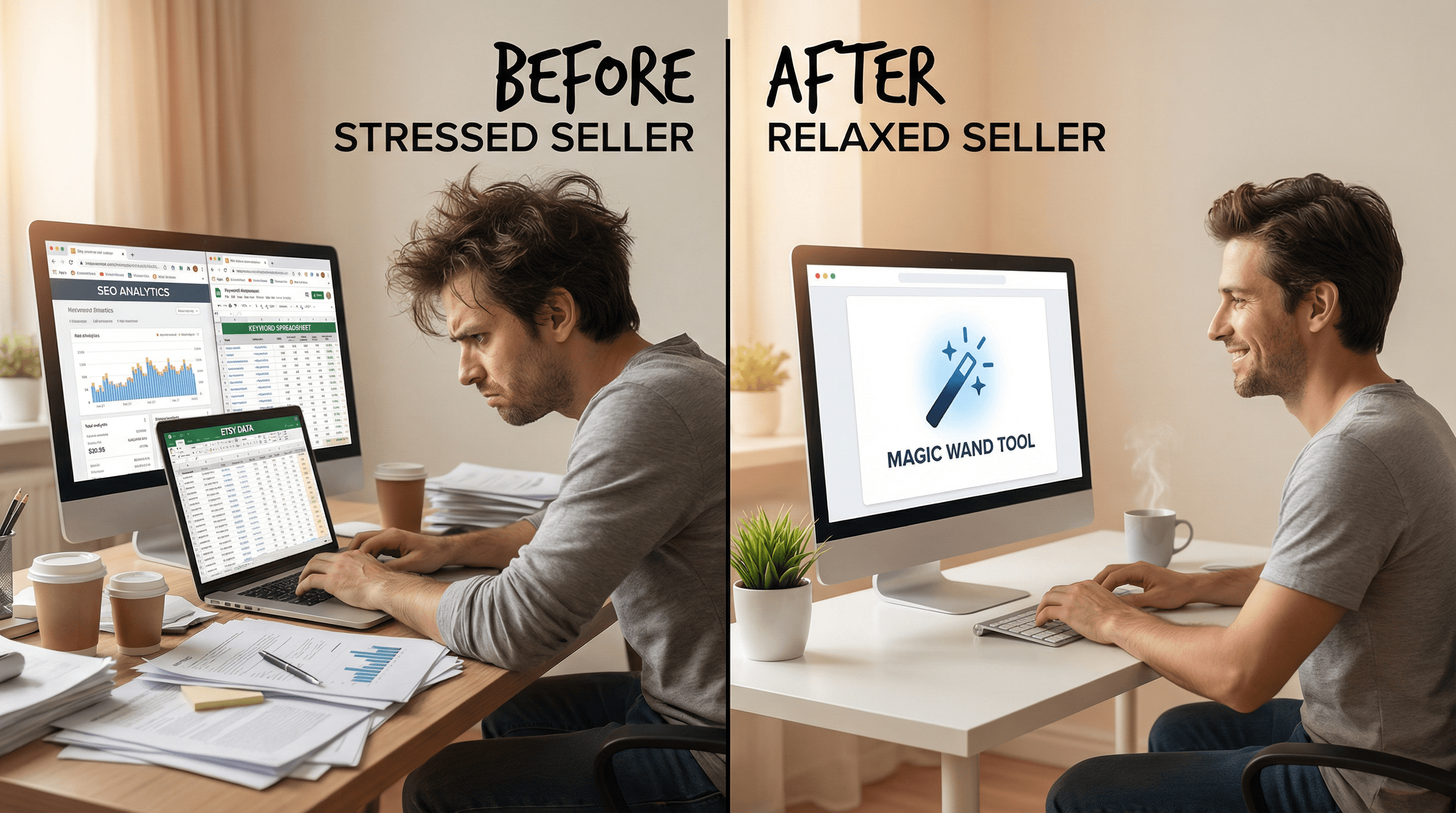 You launched your Etsy shop with dreams of creative freedom and passive income. Instead, you find yourself staring at spreadsheets of keyword data, competition scores, and search volumes at 2 AM, wondering if "vintage boho cottagecore aesthetic mug" is really better than "cottagecore aesthetic vintage boho mug." Welcome to the world of Etsy SEO, where doing everything right still feels like you are doing something wrong.