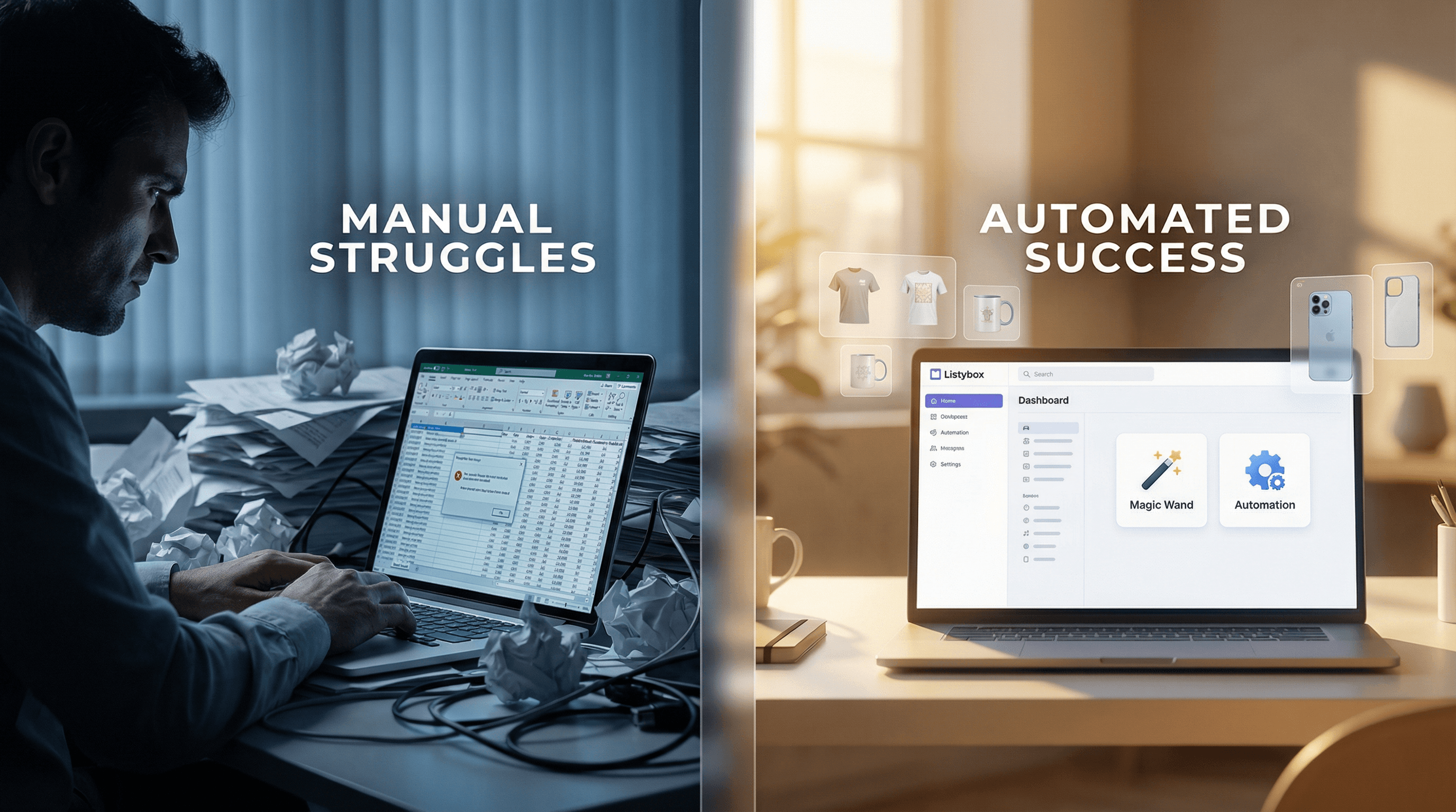 The Listybox Solution: Just as she considers quitting, Sarah switches to Listybox. She uploads all 50 designs to her My Artworks upload command center. Using the Creation Wizard, she applies these designs to t-shirts and hoodies simultaneously. The system automatically positions the artwork. In under 30 minutes, she has hundreds of listings drafted, not weeks.