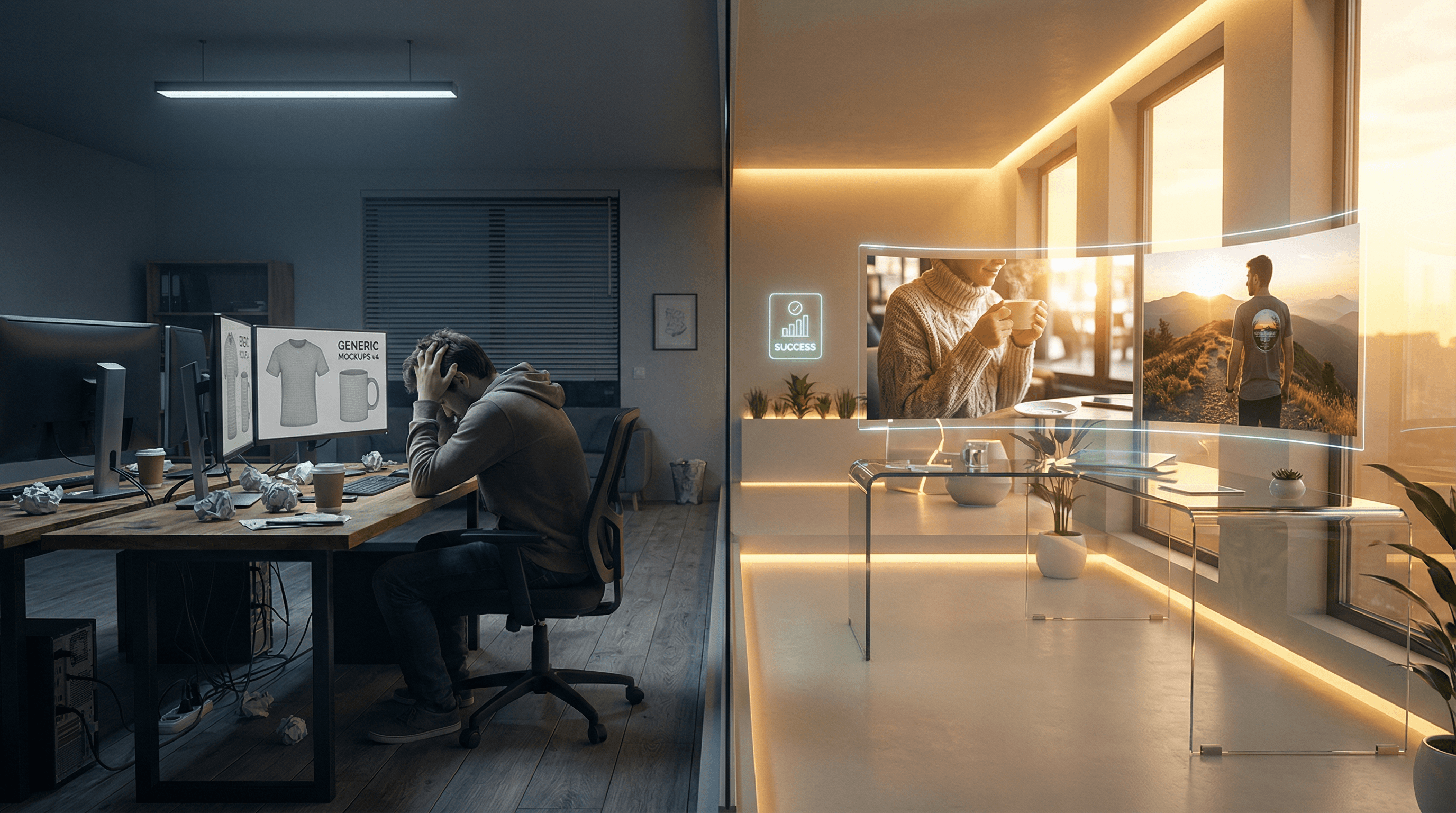 The Manual Grind: Elena orders samples for her top 5 designs ($120 cost). She waits two weeks. She tries to photograph them in her apartment, but the lighting is yellow and amateur. Frustrated, she turns to a popular mockup site. She spends countless hours downloading files, uploading her designs in Photoshop, adjusting layers, and saving them. 20 hours later, she has listing photos, but they look exactly like her competitors' images.