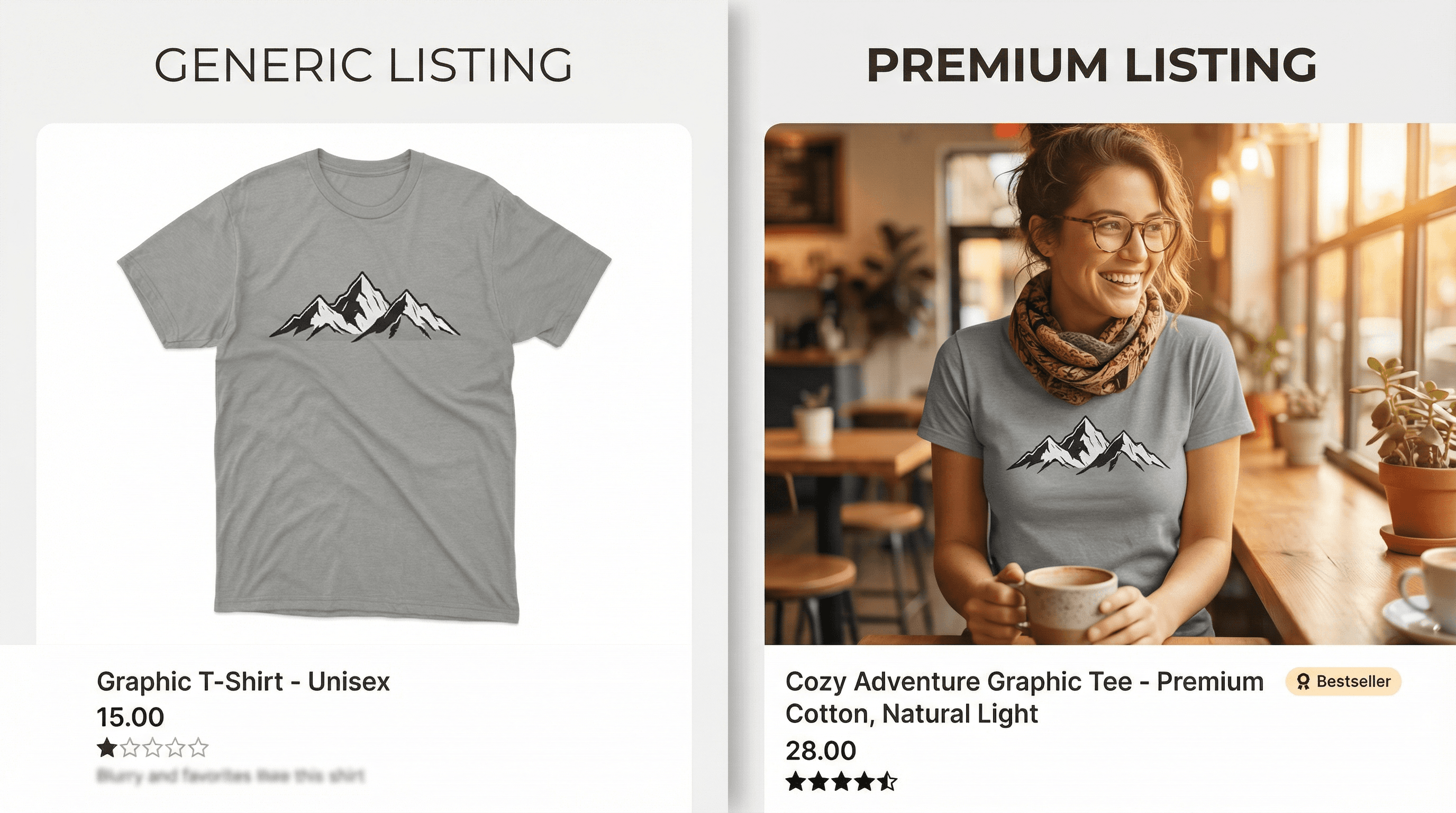 Picture this: A shopper searches "funny cat mug" on Etsy. The search results show 50 listings. Fifteen of them use the exact same Placeit mockup of a woman laughing at a mug in a modern kitchen. Your listing is one of them. How does a buyer choose? They don't—they scroll past, because nothing stands out.