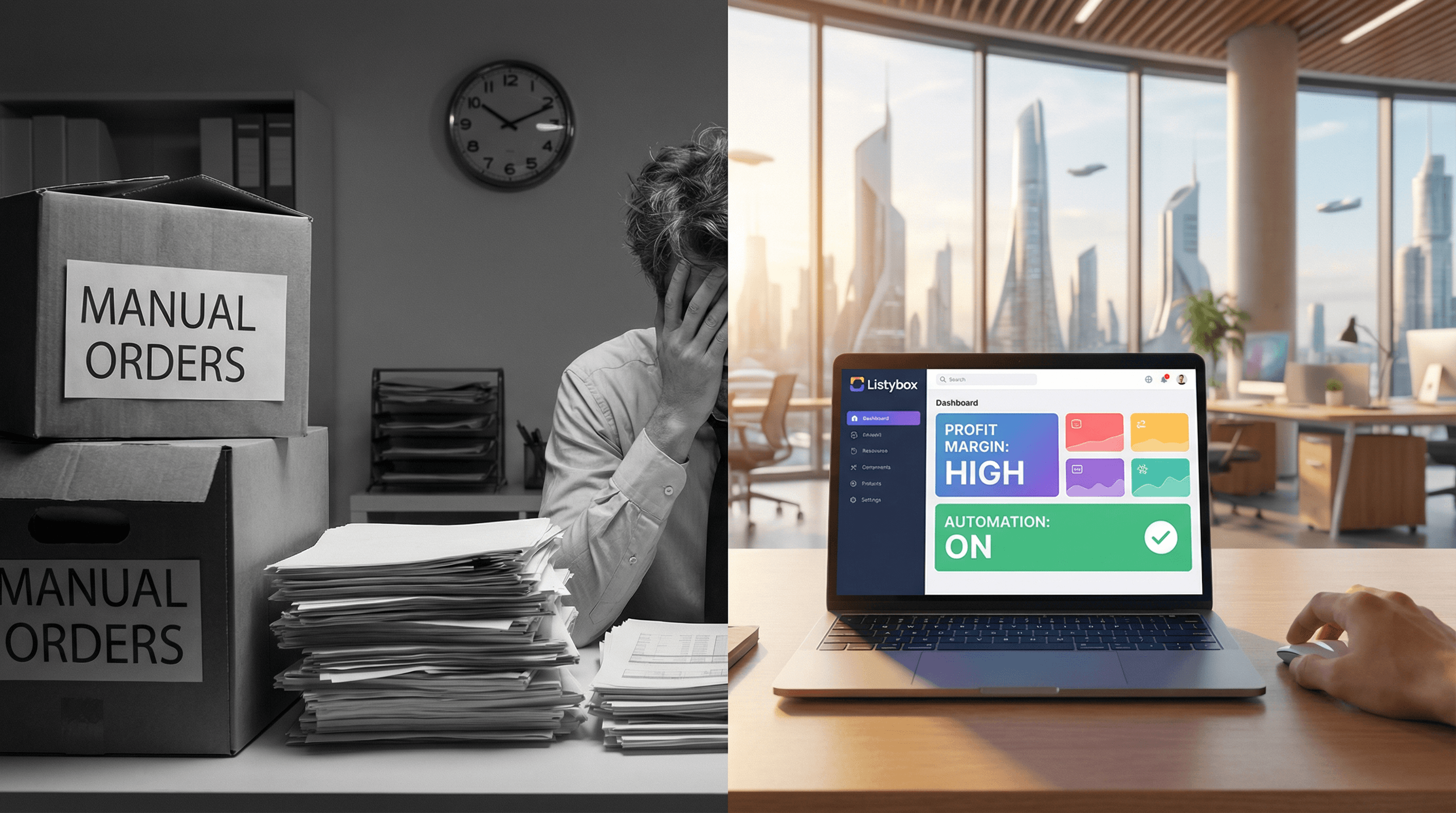 5. The Listybox Solution Just as he creates a Listybox account, the game changes. He discovers Zero-Touch Order Management. Now, when an order comes in, Listybox detects the stockout and automatically routes the order to the next best pre-approved provider. Even better, thanks to the Lowest Price Guarantee, Arda automatically gets the "Premium" tier pricing on production costs without paying a monthly fee to the provider.