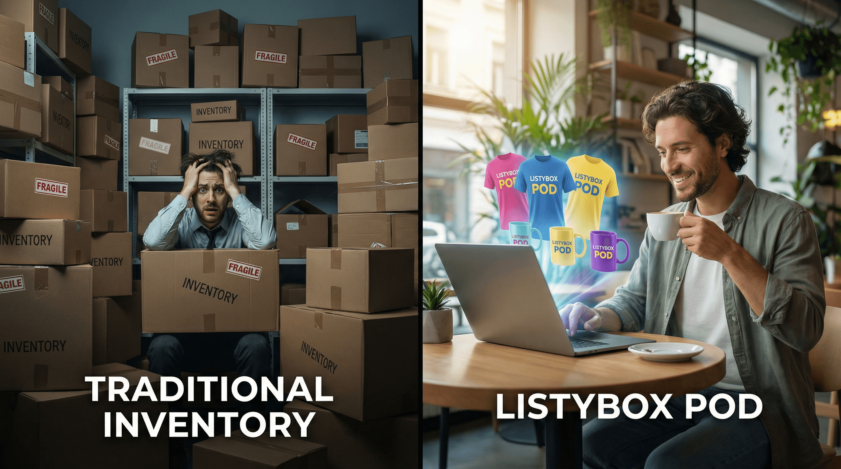 3. Print on Demand (POD) & Listybox Siz tasarımı yaparsınız, ürün (tişört, kupa, vb.) sadece müşteri satın aldığında üretilir ve müşteriye kargolanır.