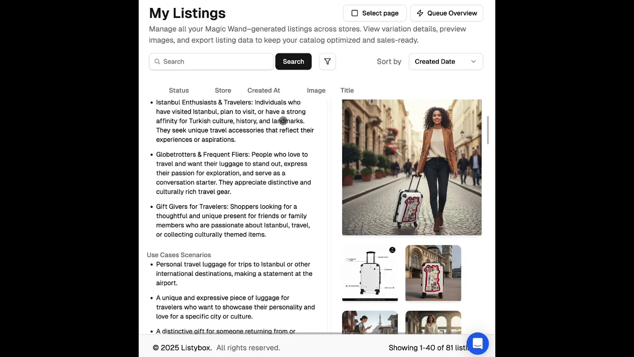 Magic Wand'ın gerçek gücü, ölçeklendiğinde ortaya çıkar. ChatGPT veya diğer araçlarda her listeleme için tek tek, 10 dakika harcamak yerine, Listybox'ta 100 creation seçip tek tıkla hepsine birden listeleme metni oluşturabilirsiniz.
